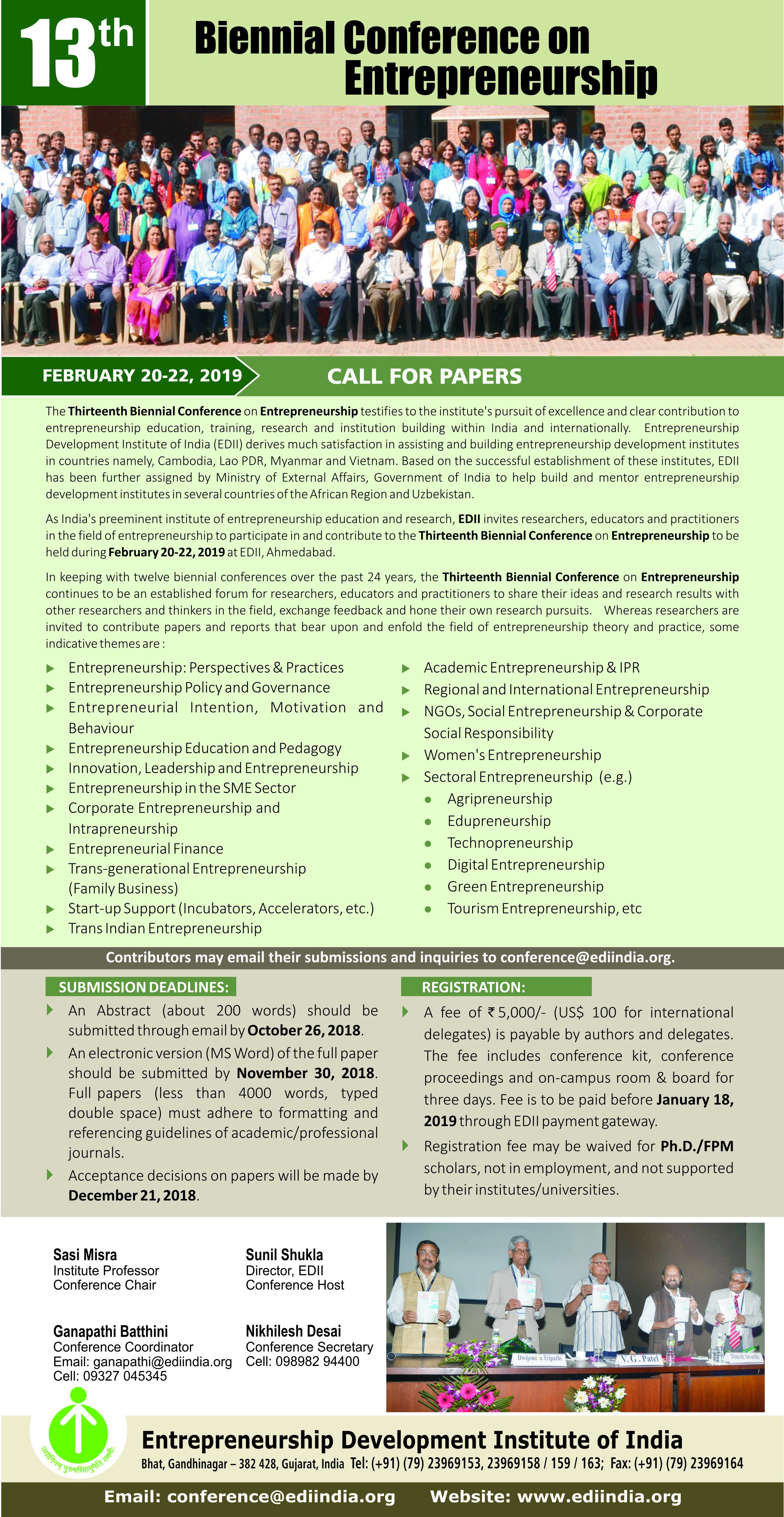 Entrepreneurship Development Institute of India (EDII), has been organizing Ahmedabad organizes ‘Biennial Conference on Entrepreneurship’ since 1994. The Biennial Conferences continue to provide a forum for researchers, educationist and practitioners to share their research findings and experience in the field of entrepreneurship development. Deliberations on issues that are of contemporary relevance and interest have opened up new avenues to spearhead entrepreneurship at a much wider scale. The Conference is organized under the aegis of the Centre for Research in Entrepreneurship Education and Development(CREED)setup by EDII.